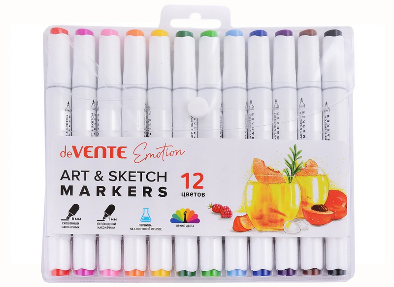 Набор маркеров для скетчинга имеет 12 ярких цветов. Каждый маркер двусторонний: с одной стороны маркера классическое скошенное долото , с другой стороны - пулевидный наконечник
